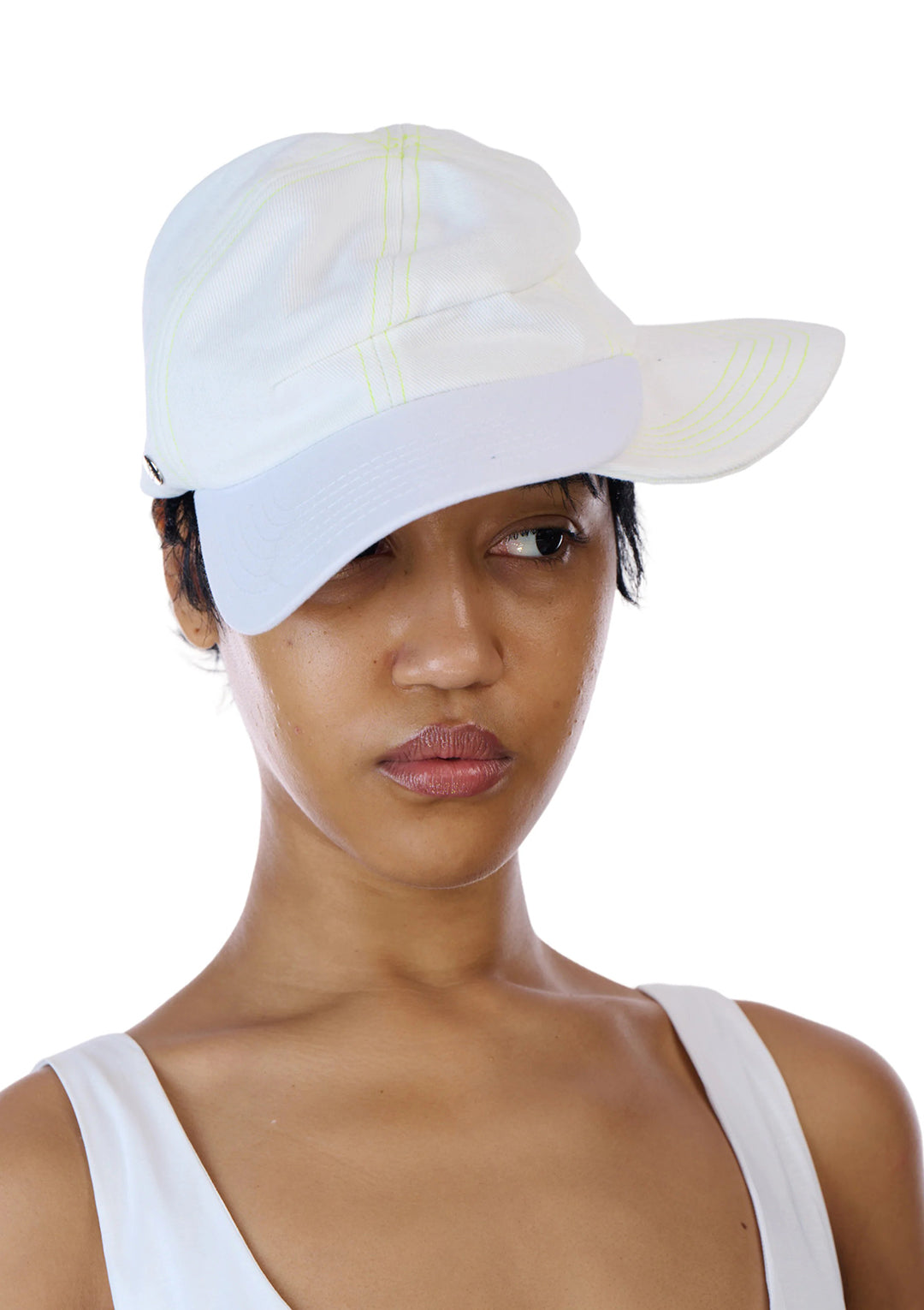 Cotton twill cap in off white. Paneled crown with a permanent creased body and staggered brim construction.