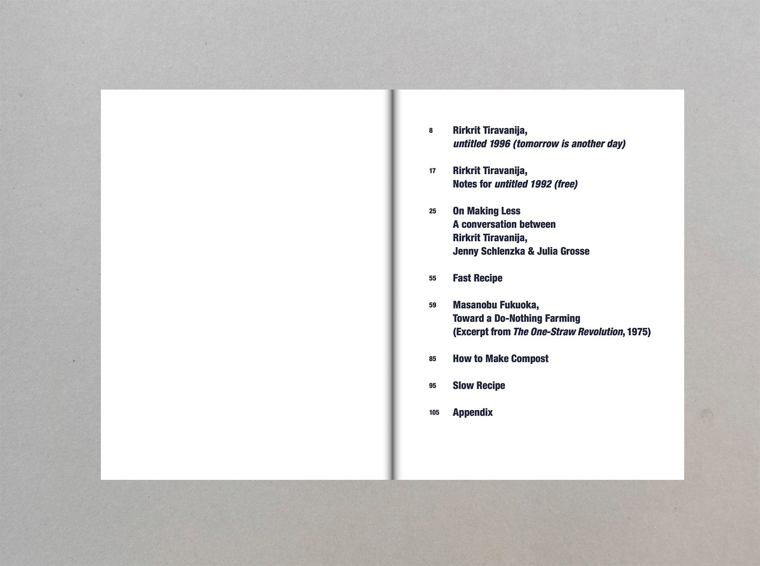 In this book, Rirkrit Tiravanija compiles various ideas and approaches to this method on 128 pages, including an essay from the 1970s about “Do-Nothing Farming” by Masanobu Fukuoka, a pioneer of today’s organic farming. He also shares a fast recipe for a Negroni, a slow recipe for fish sauce and instructions for composting, and provides insights into his process-oriented work.