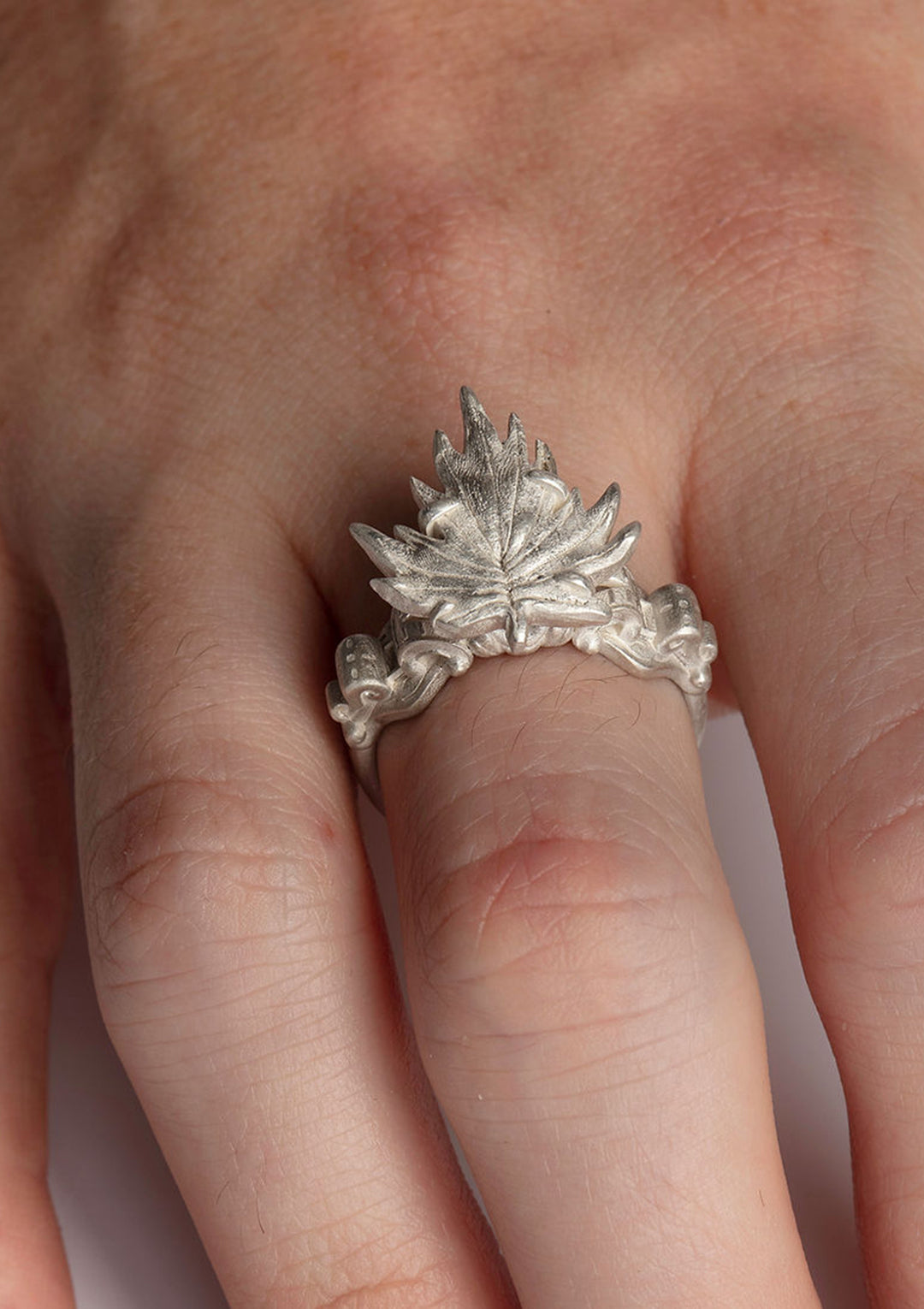 Replica of Rupert’s Ring bearing ‘The First Maple’, the Crown Jewel of the Sovereign Elector of Rupert’s Land and the Hudson’s Bay Company (HSBC). Rupert’s Ring was assembled by its namesake Prince Rupert of the Rhine after his journey to Canada and subsequent consolidation of Rupert’s Land. The ring, a patrimonial jewel of the Palatinate, was mounted with an ancient piece of carved ivory depicting a maple leaf. The relic of the North was secured a century earlier on Baffin Island by Martin Frobisher during his war against the Inuit. Lost after the Battle of the Bay and the absorption of Rupert’s Land into Canada proper in 1870, the HSBC Crown Jewel was recovered in 1982 and toured Canada as a supplement to the ceremony of Partition initiated by Prime Minister Pierre Trudeau. Following the celebration surrounding repatriation of the constitution, the ring was disassembled, the jeweled band sent to the Royal Ontario Museum, while the leaf was given a central position in the Canadian Museum of Civilization in Quebec. Determined by carbon dating to be between 3,900 and 3,600 years old, ‘The First Maple’ is the earliest depiction of a maple leaf on the continent, an ur-object of Canadian aesthetic culture. LMX Unlimited has reunited the two elements, reforming the original mounted ring using precise 3D Scanning. This replica is made to scale in sterling silver, allowing for a precise recreation of the Crown Jewel of Rupert’s Land.