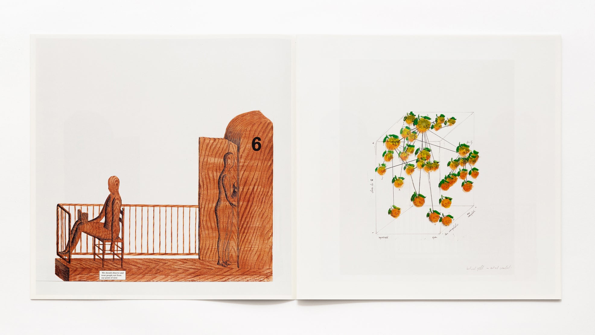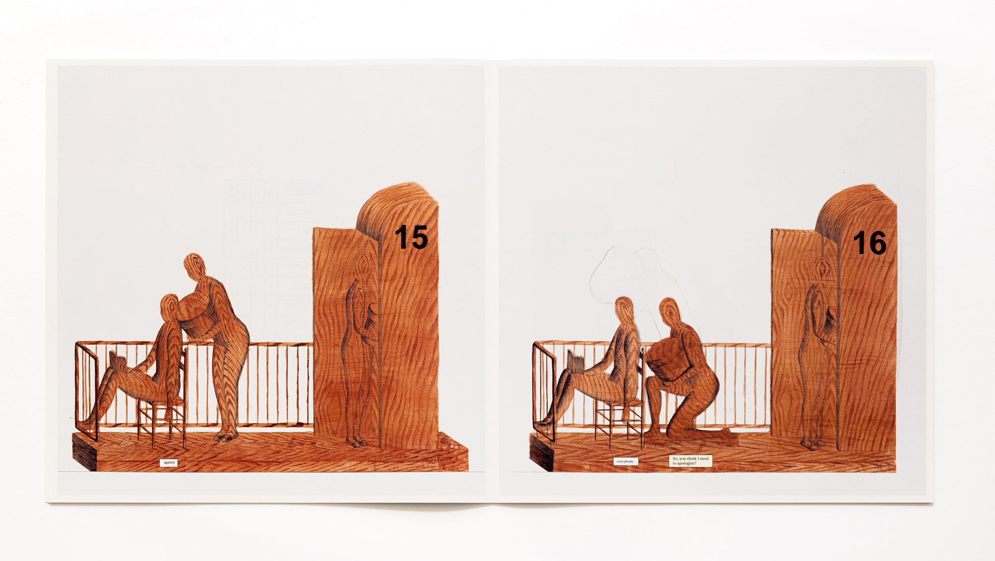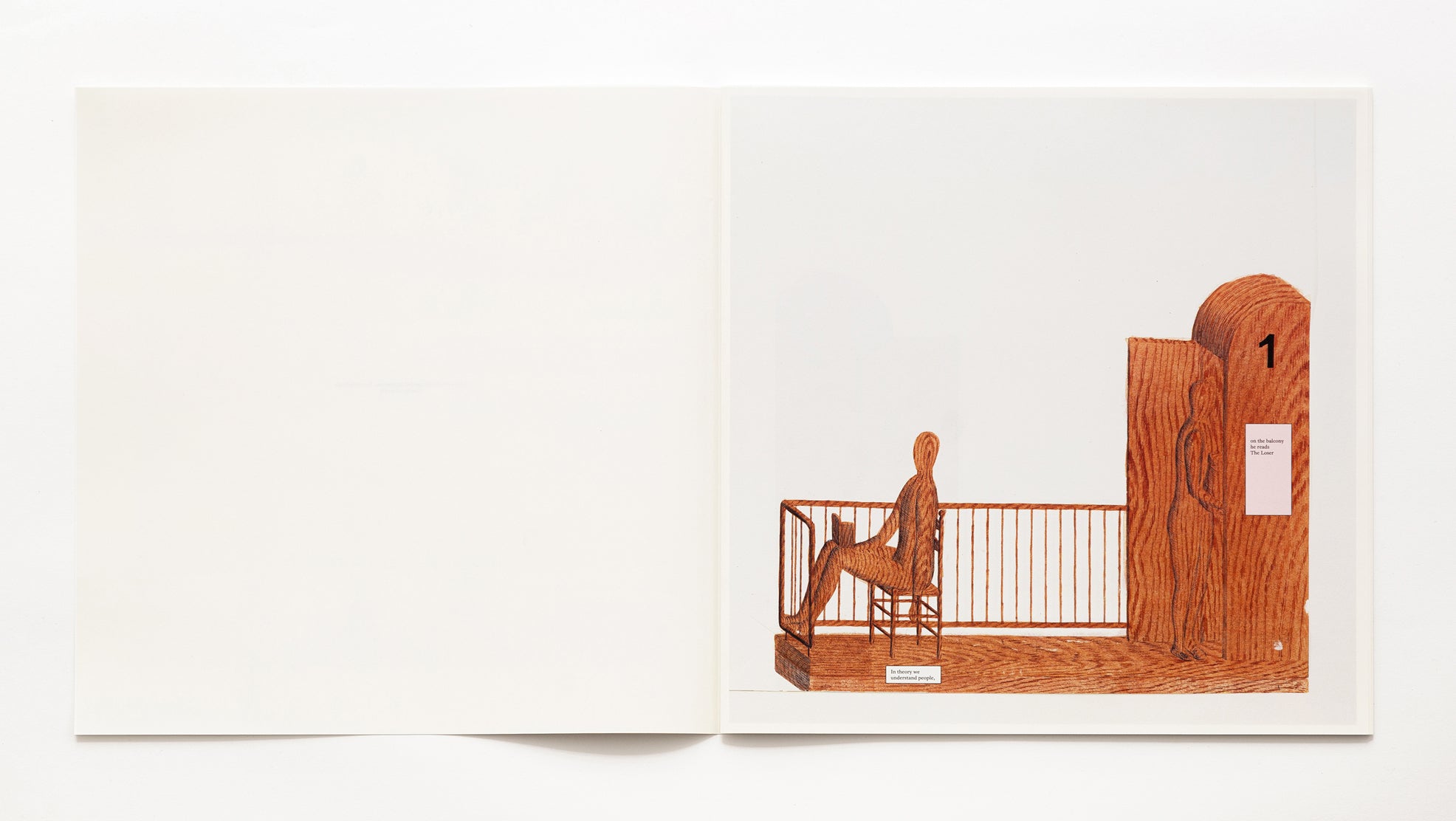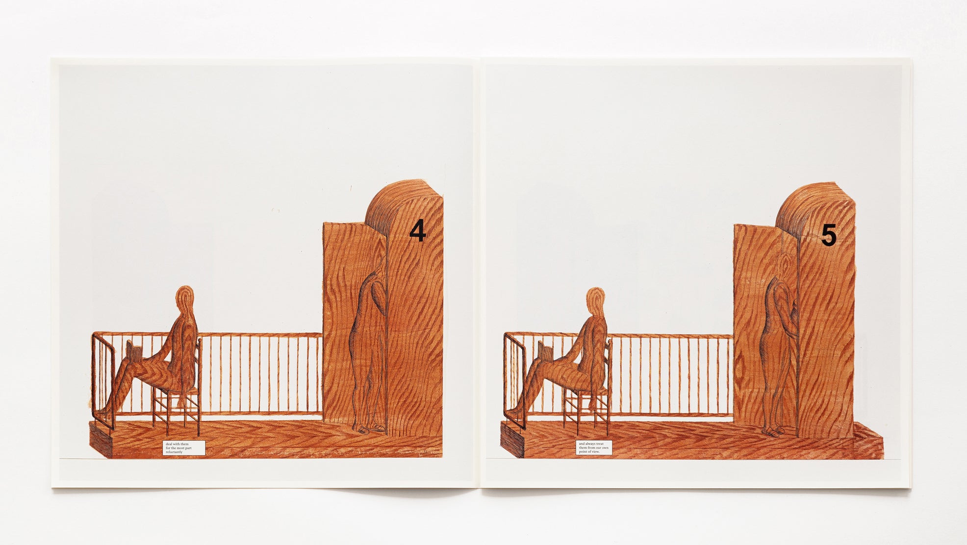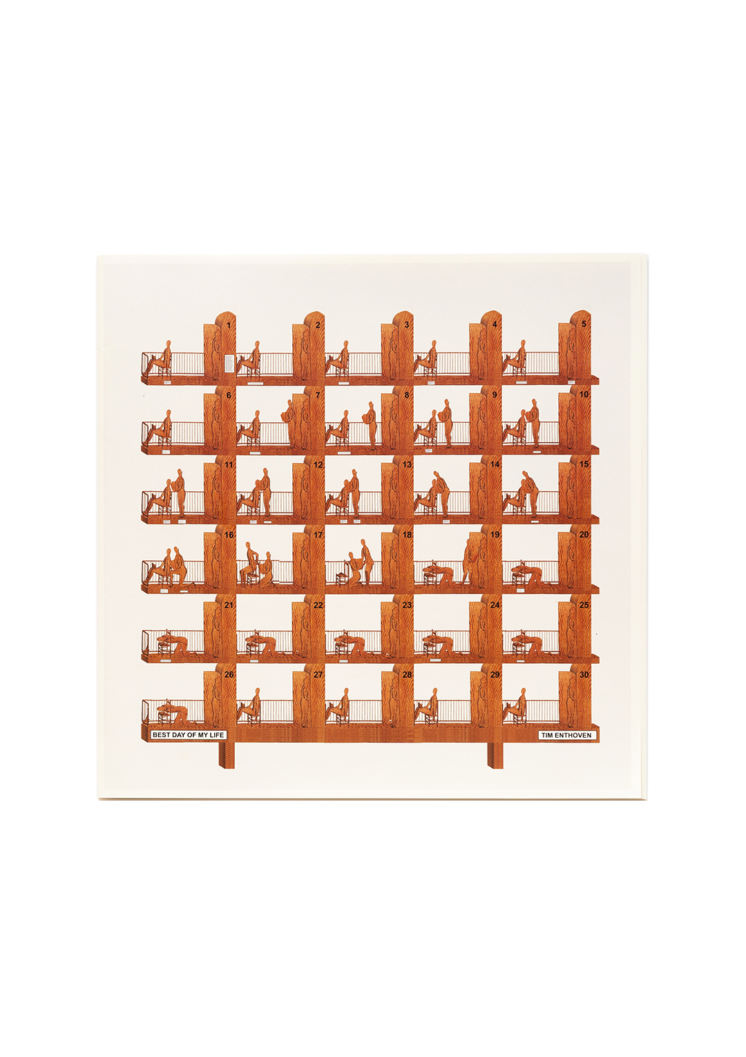 Best Day Of My Life is an artist book by Tim Enthoven that obsessively zooms in on a small, apparently mundane interaction on a balcony and stretches it out over 44 pages. While it is initially clear that one person is reading a book -The Loser by Austrian author Thomas Bernhard- the precise relationship between the people, their identity, or even the nature of their interaction remains ambiguous. Contributing to this ambiguity is the fact that the artist hand-drew all the scenes in elaborately patterned wood. Only a few colorful diagrams break the suspense and give hints as to the precise relationship of the figures.