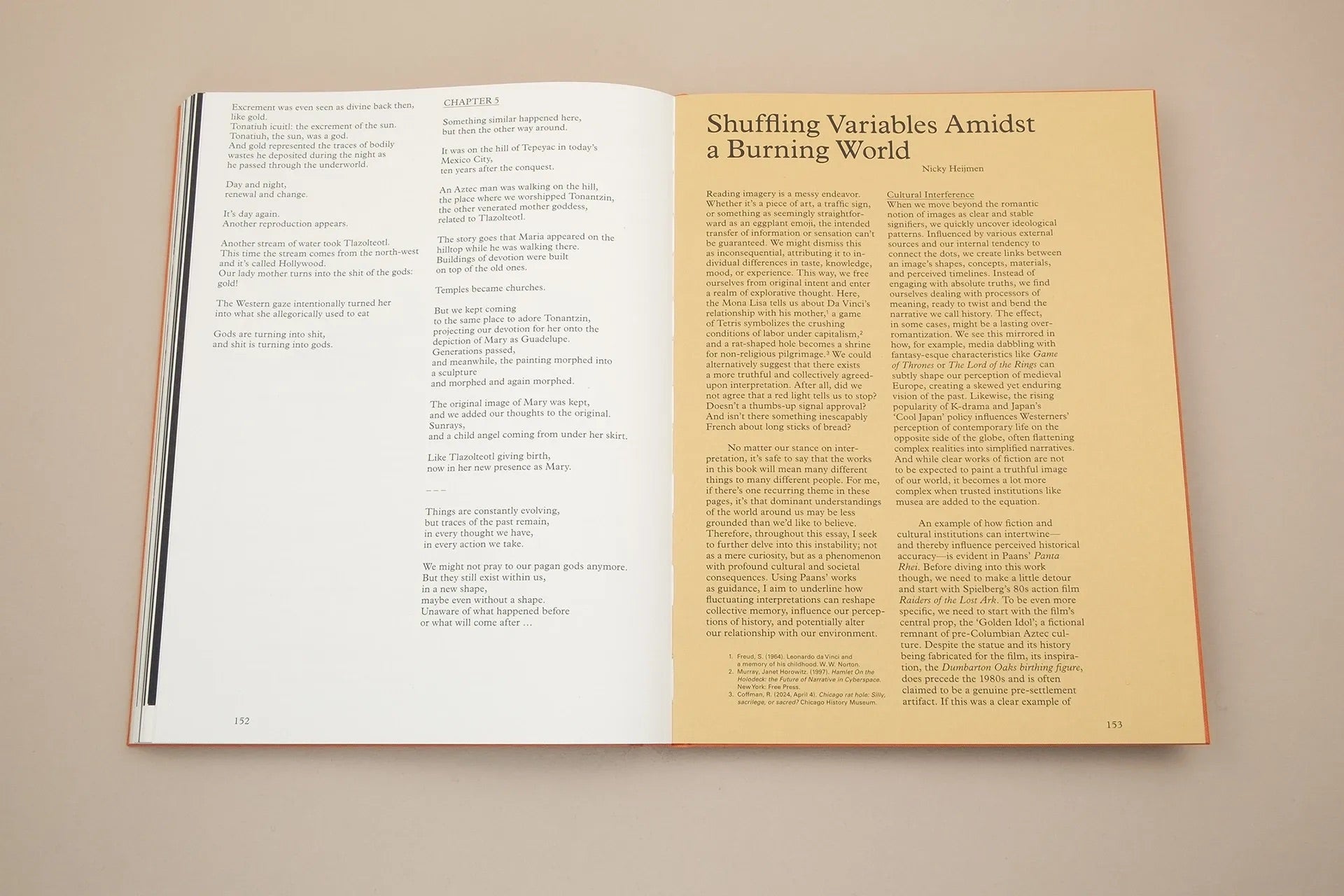 Floating Signifiers is a rich, comprehensive book, in which Paans has translated his philosophical reflections on the imaginary nature of time and space into a meaningful form. In the complementary essay, Nicky Heijmen investigates how the original meanings of cultural objects can change and what the impact of this is on a broader social level.