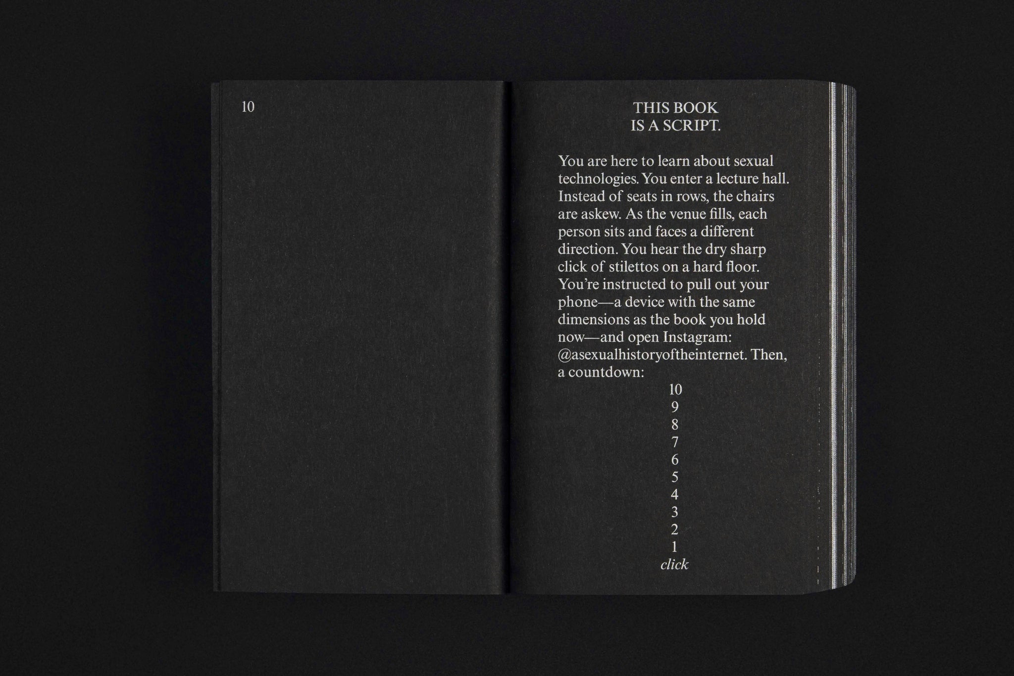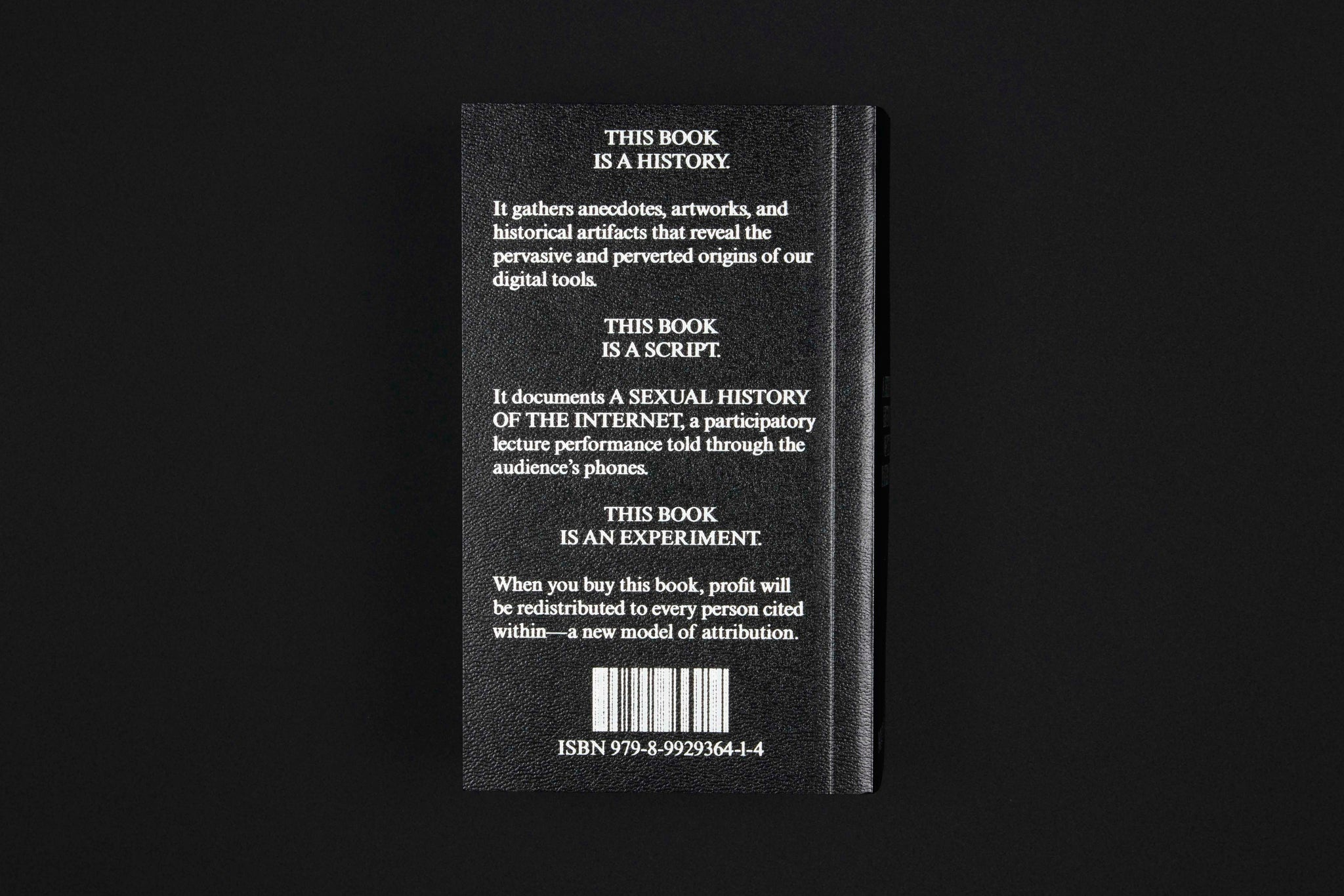 THIS BOOK IS A SCRIPT. It documents A Sexual History of the Internet, a participatory lecture performance told through the audience’s phones. It is a polyvocal story, whose citations are read aloud by the audience — performance as re-citation.