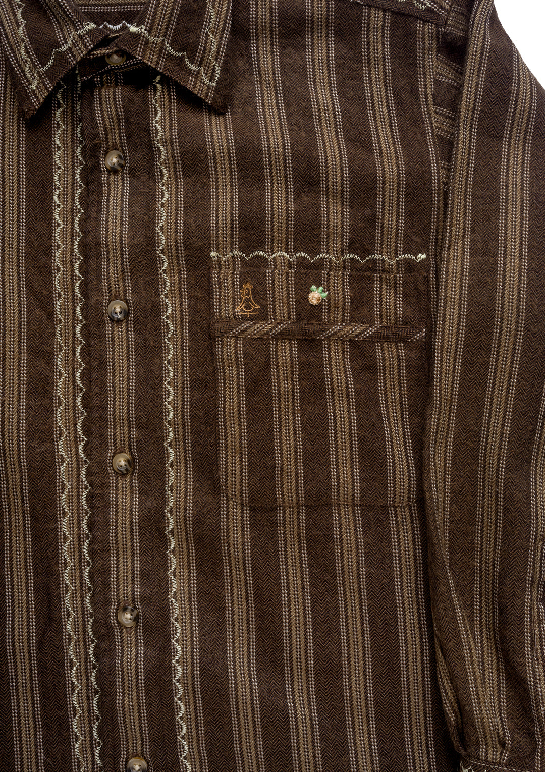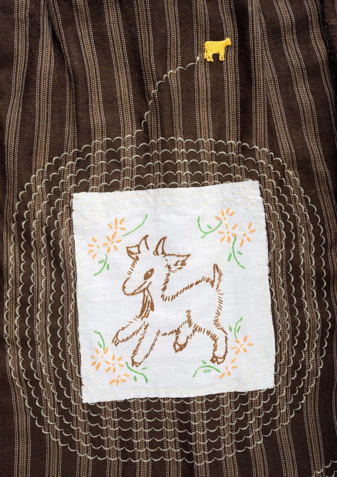 vintage japanese wool-blend button up features vintage hand embroidered quilt square, deadstock vintage patches, hand sewing, and scalloped embroidered detailing.