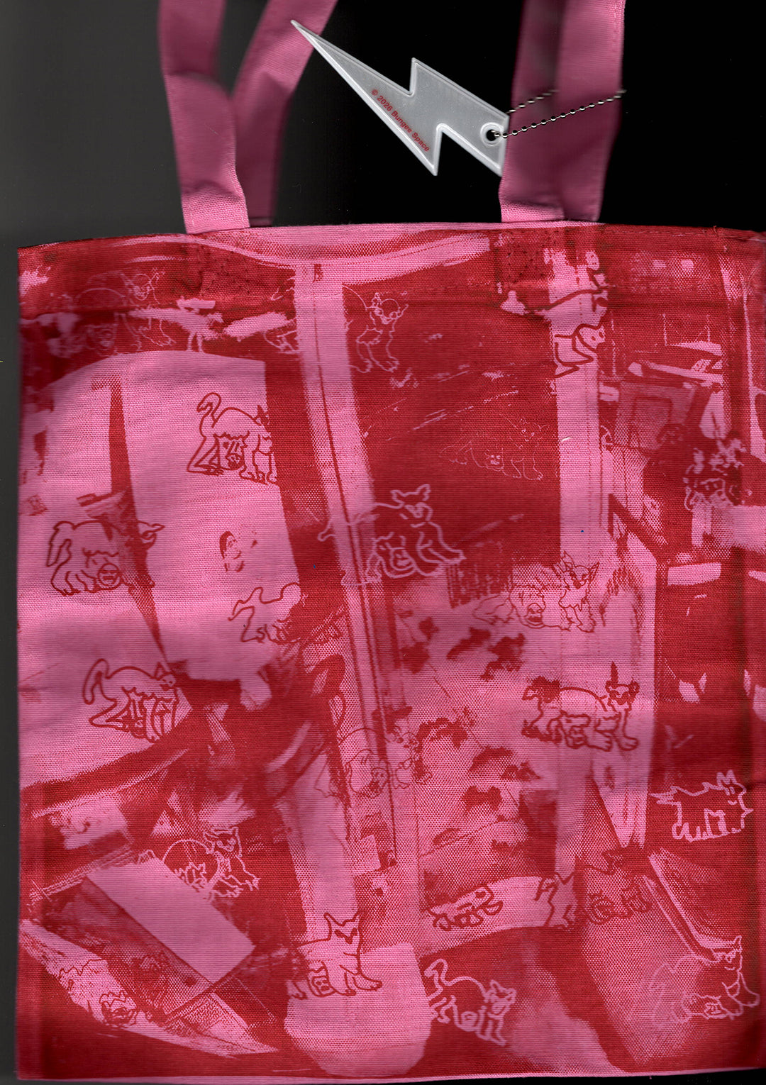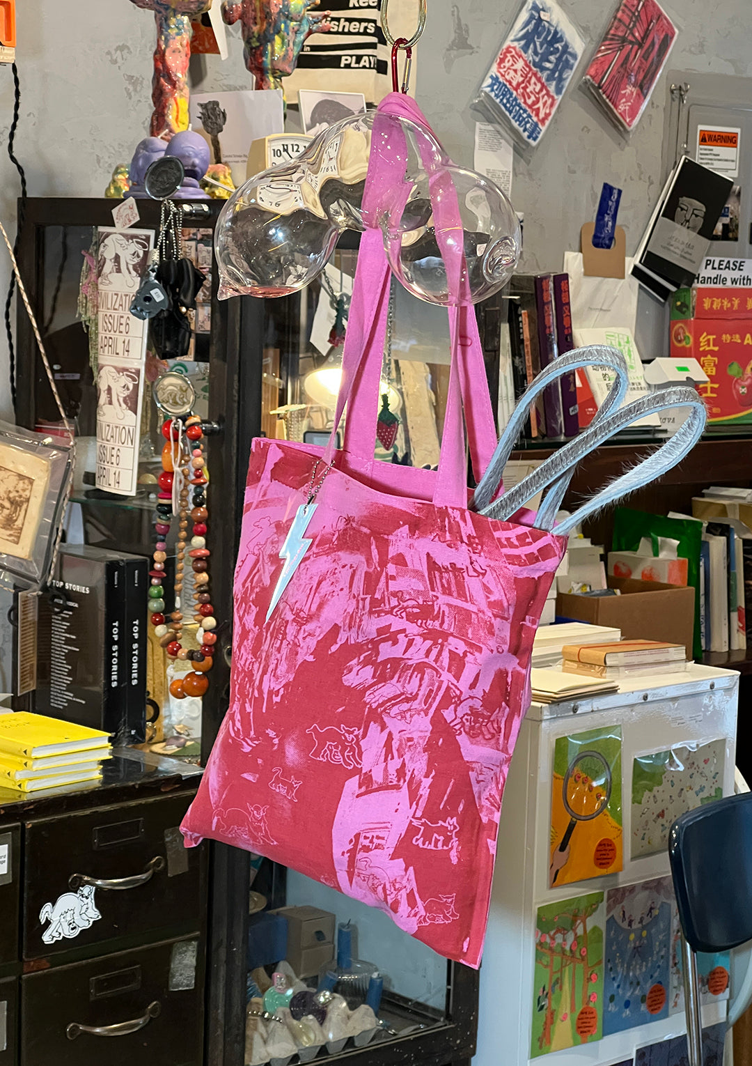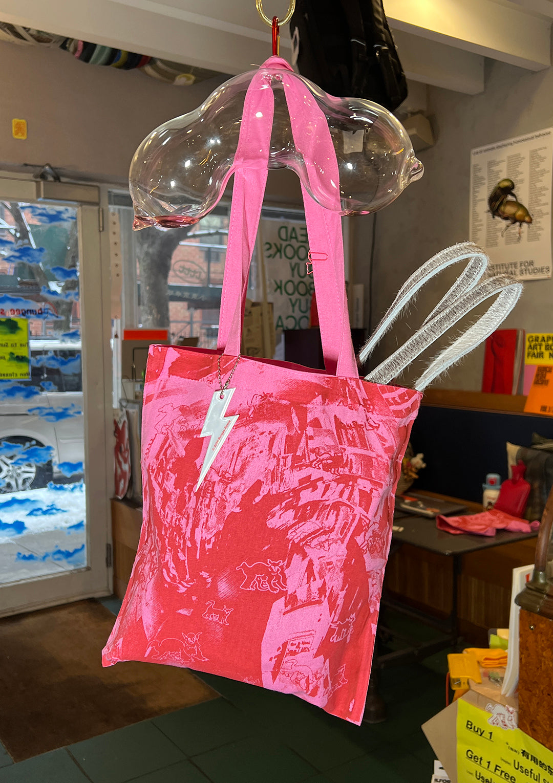 Silk screen printed on 6oz cotton canvas tote, with Bungee safety reflective keychain attached. 31*34cm