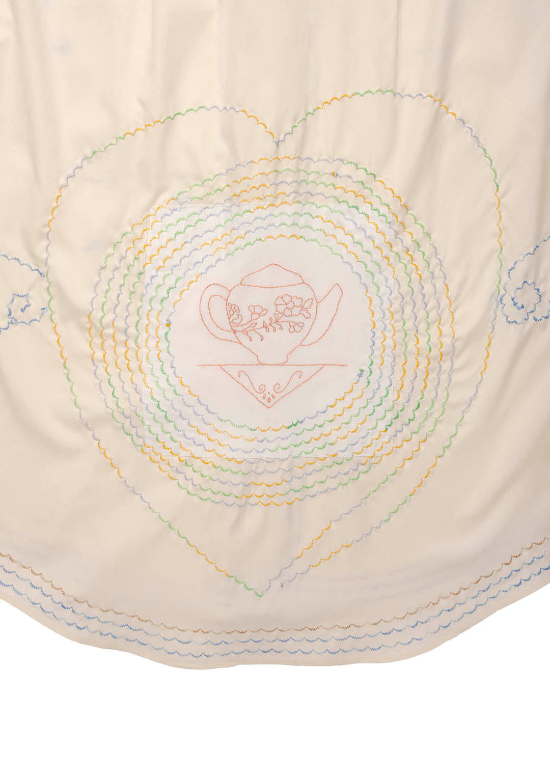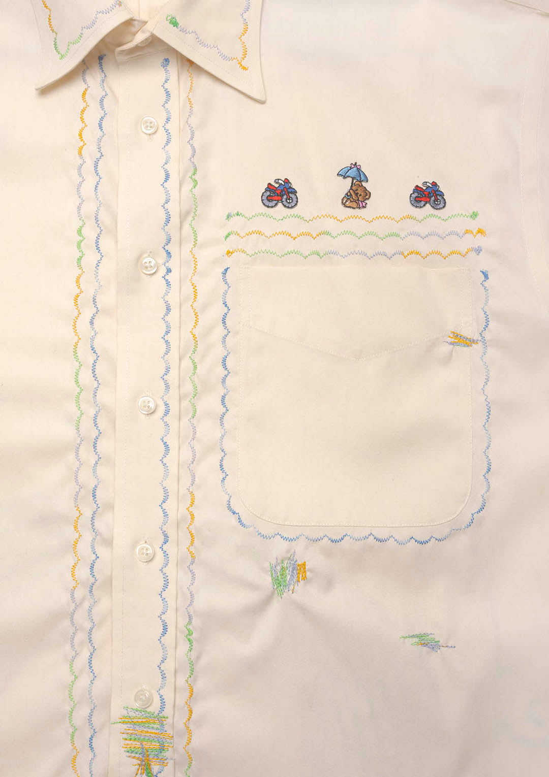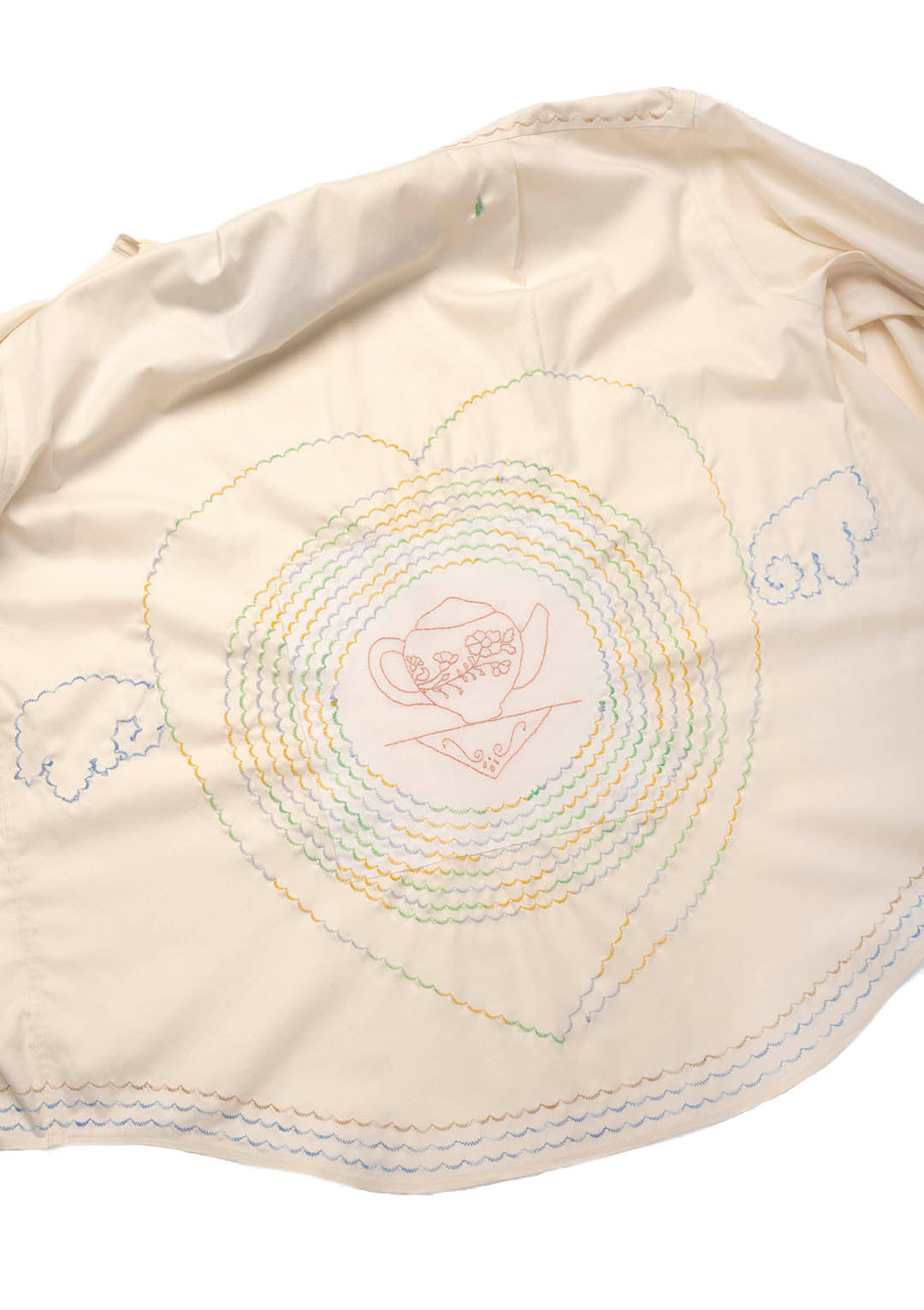 creamy eggshell / off-white button up with scalloped embroidered detailing, zig zag mends, a vintage hand embroidery, and dead stock iron ons - spiralling embroidered infinity heart with wings