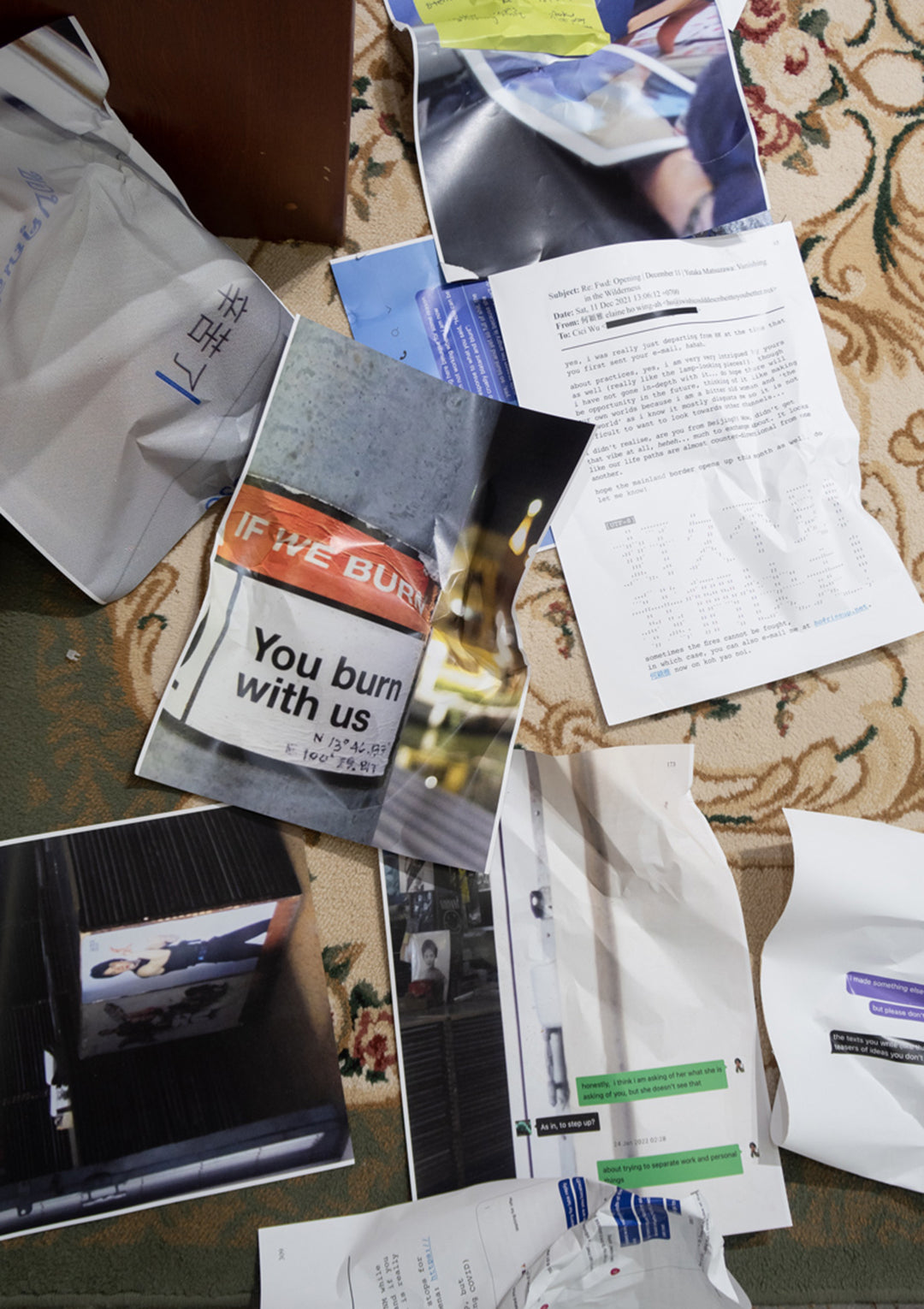 《Resident, or Resident Evil, or This Minor Contextualisation of a Minor Temporality Known as Publishing on the Run》的主體被審核、校對,被編輯為一部自2021年12月7日至2022年4月13日期間的書信體檔案。作為新冠疫情時旅行的特權和雙重身分不穩定性的肖像,作者展露複雜性和共謀,書寫交流在不同名義下的朋友們、僱員和合作者的無序蔓延網絡——時而在行政勞動的領域,時而反思的、激進地親密、或饒舌。該卷匯編不同短文、電子郵件通信、藝術家當時在閱讀的書籍摘錄,以及值得印刷的文獻。