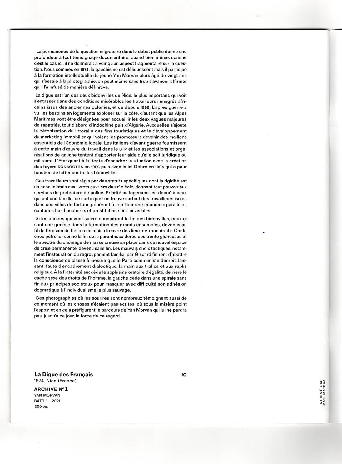 “The permanence of the migration issue in the public debate gives depth to any documentary testimony, even if, as is the case here, it only gives a fragmentary view of the question. It was 1974, leftism was decaying, but it participated in the intellectual formation of the then twenty-year-old Yan Morvan, who tried his hand at photography, and it is safe to say that he infused it with a definitive meaning.