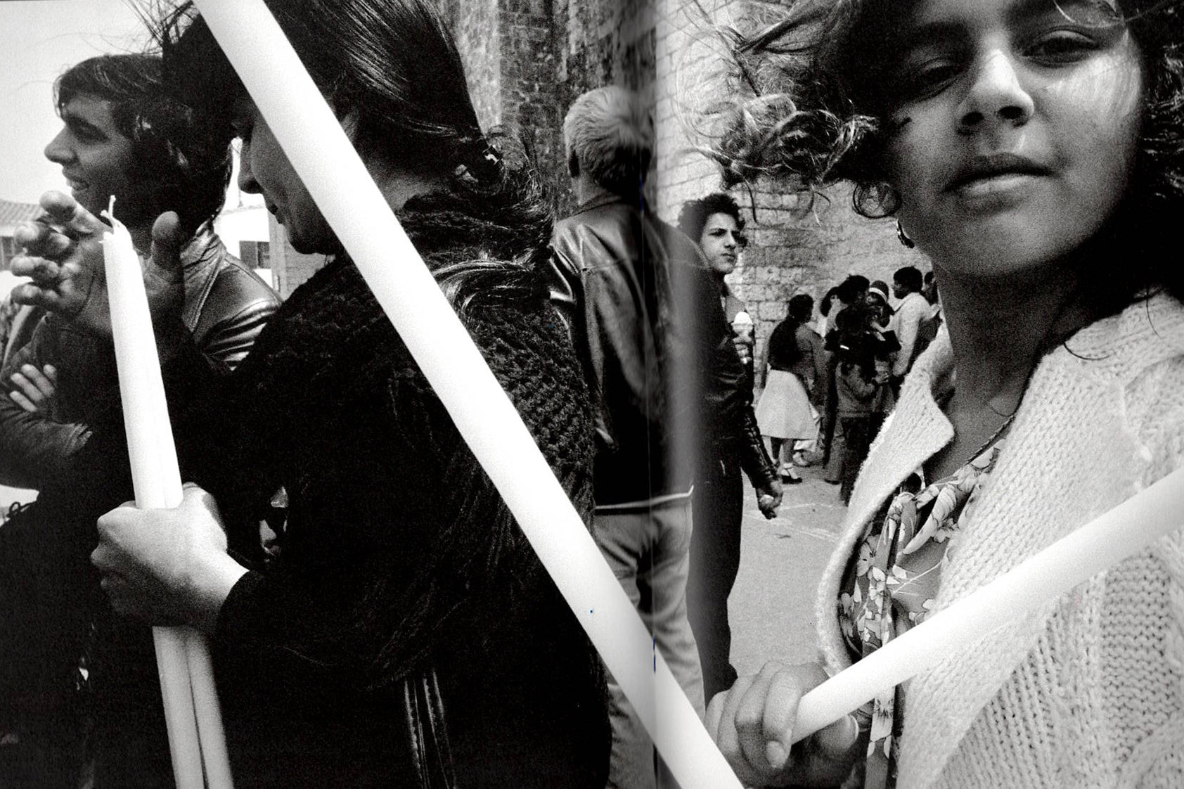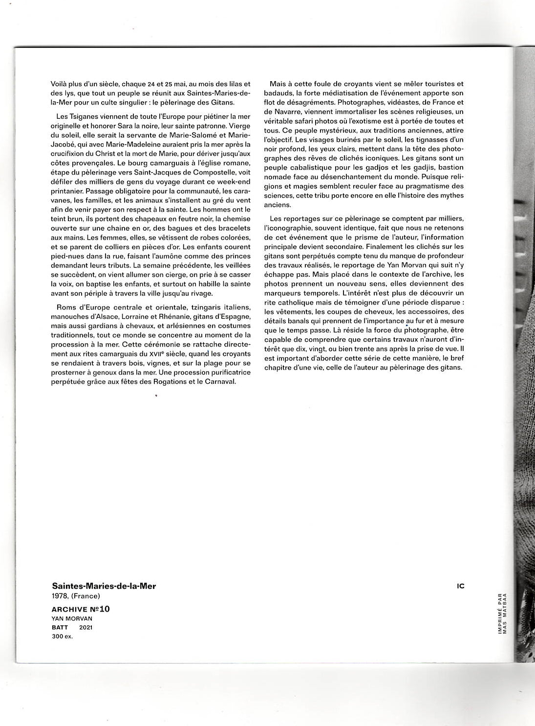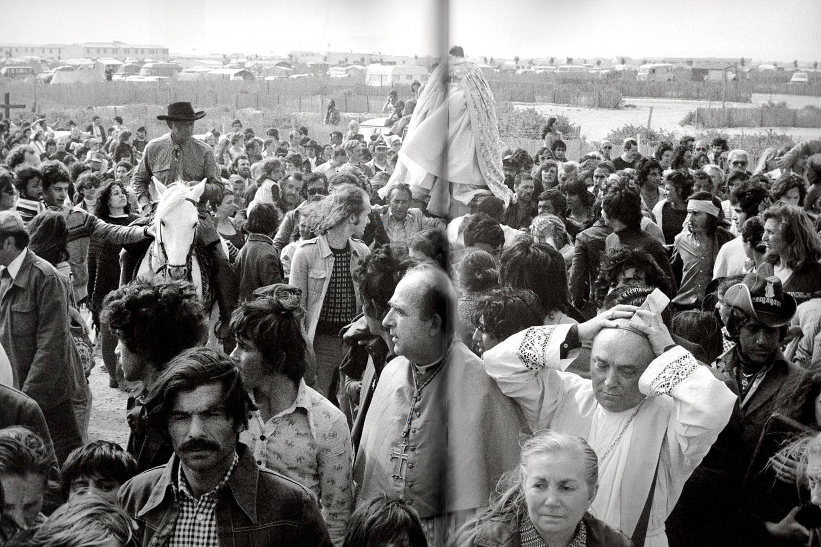 “There are thousands of reports on this pilgrimage, and the iconography, often identical, means that we only retain the author’s prism of this event, the main information becoming secondary. In the end, clichés about gypsies are perpetuated due to the lack of depth of the work done, and the following report by Yan Morvan is no exception. But placed in the context of the archive, the photos take on a new meaning, they become temporal markers. The interest is no longer in discovering a Catholic rite but in bearing witness to a vanished period: clothes, haircuts, accessories, banal details that take on importance as time passes. This is the strength of the photographer, to be able to understand that certain works will only be of interest ten, twenty, or even thirty years after they were taken. It is important to approach this series in this way, the brief chapter of a life, that of the author on the gypsy pilgrimage.”