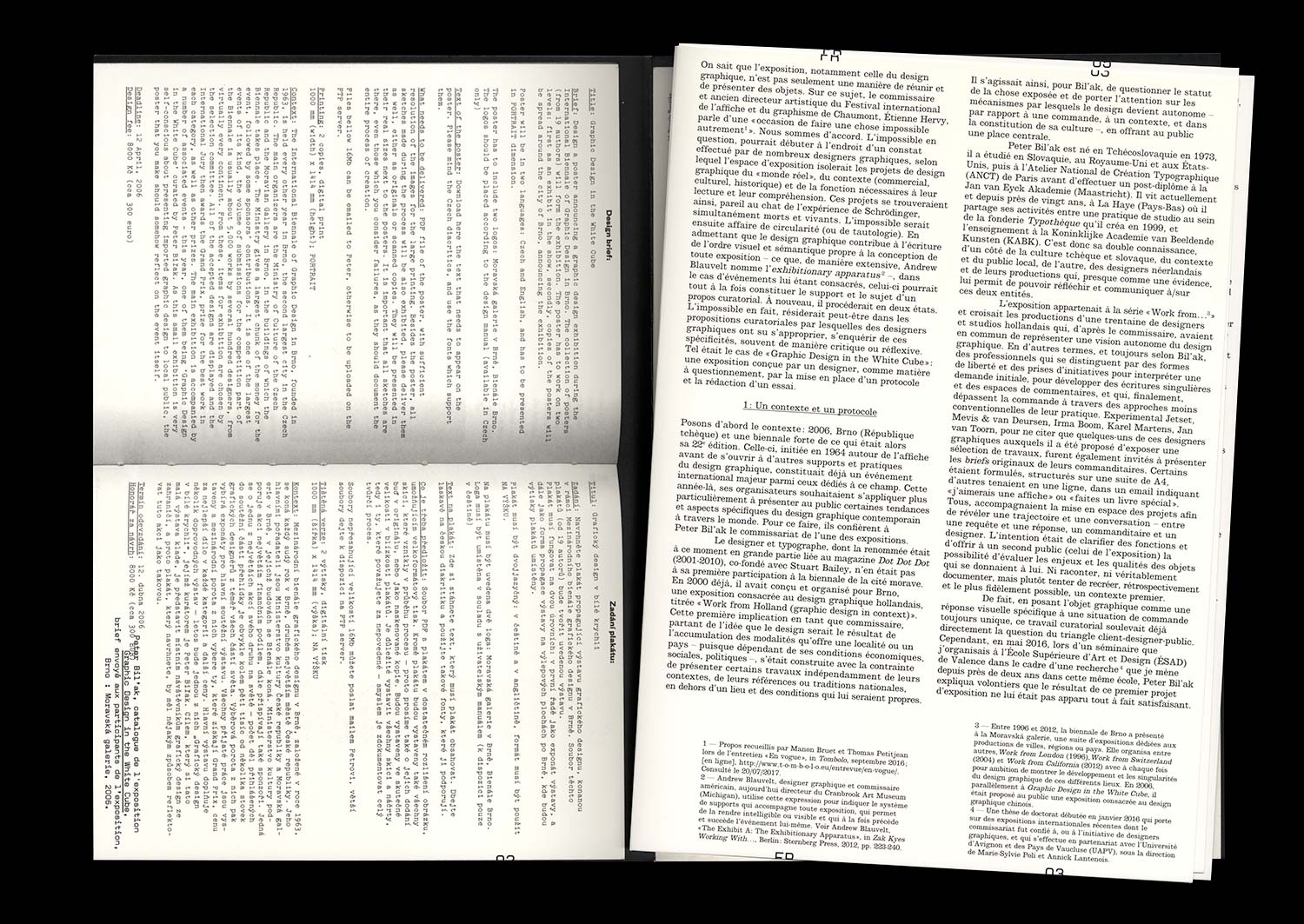 This strategy, which doesn’t hide its self-referential nature, was accompanied by an essay, written by Bil’ak himself; a text that continues to be regularly cited when the question of approaching the exhibition of Graphic Design as a subject arises. Our study will engage the analysis of this latter in order to question the characteristically theoretical approach of this project. It will attempt to place the reflexive, discursive approach and the editorial part of this curatorial proposition within the recent history of Graphic Design. It will also try to show how the positions taken will lead to a form of redefinition of Graphic Design.
