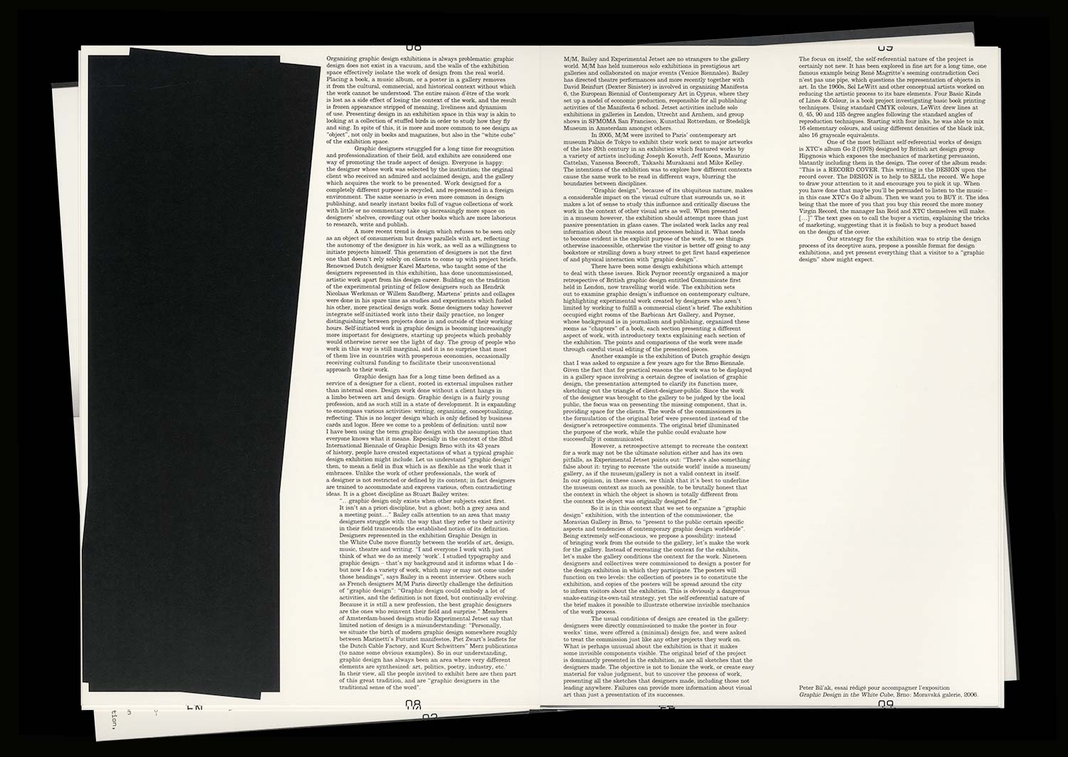 With this invitation, the designer/curator wished to respond to the idea that the exhibition space isolates Graphic Design creations from the real world, from context (commercial, cultural, historic) and from the function that is necessary for reading and understanding them. He thus chose to make the conditions of the exhibition space (in this case the Moravian Gallery) the context for the creations, and to exhibit the work of Graphic Designers rather than objects.