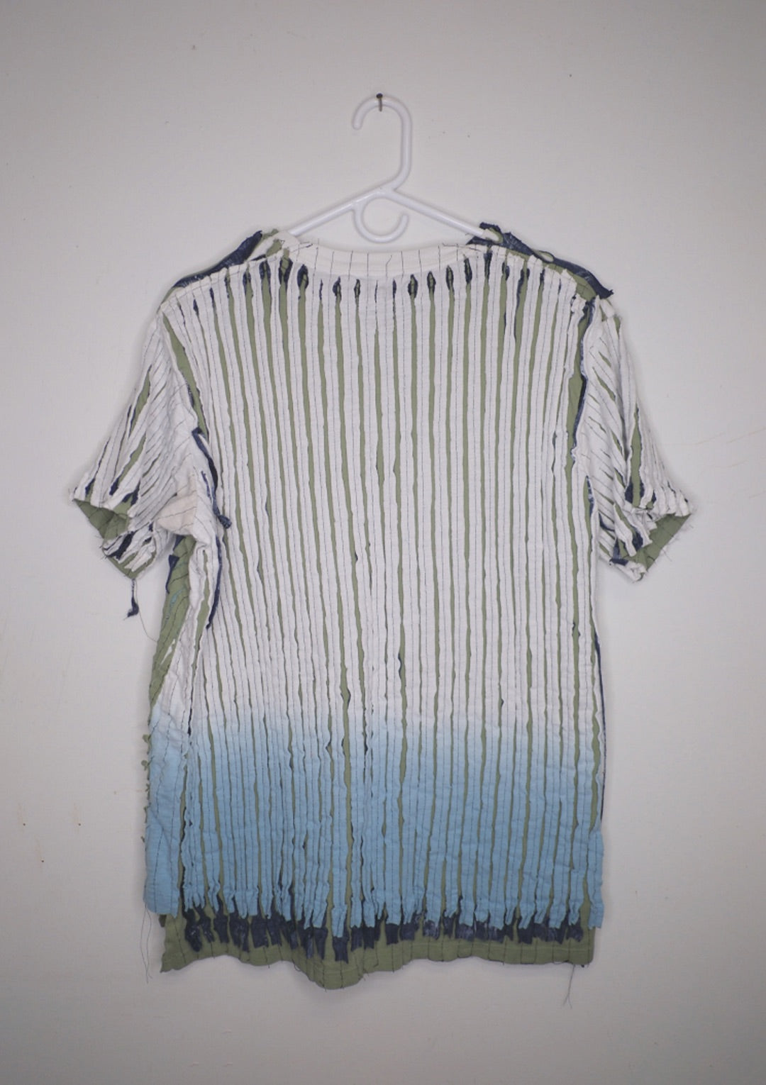 Zero waste, one of a kind, and sold as is; holes and hanging threads are intentional within the design.