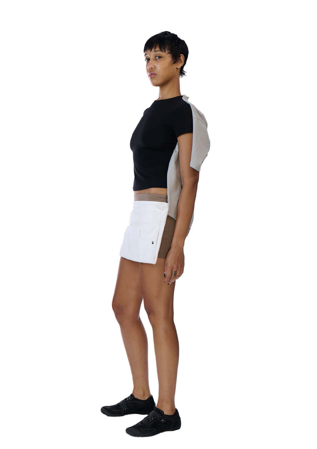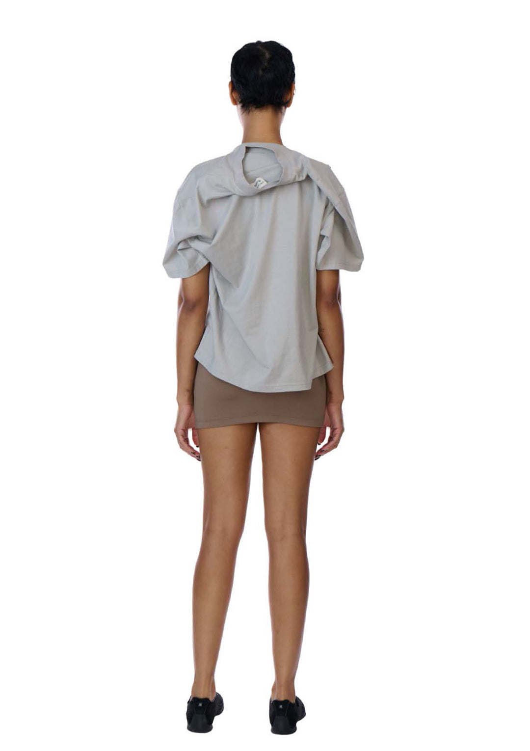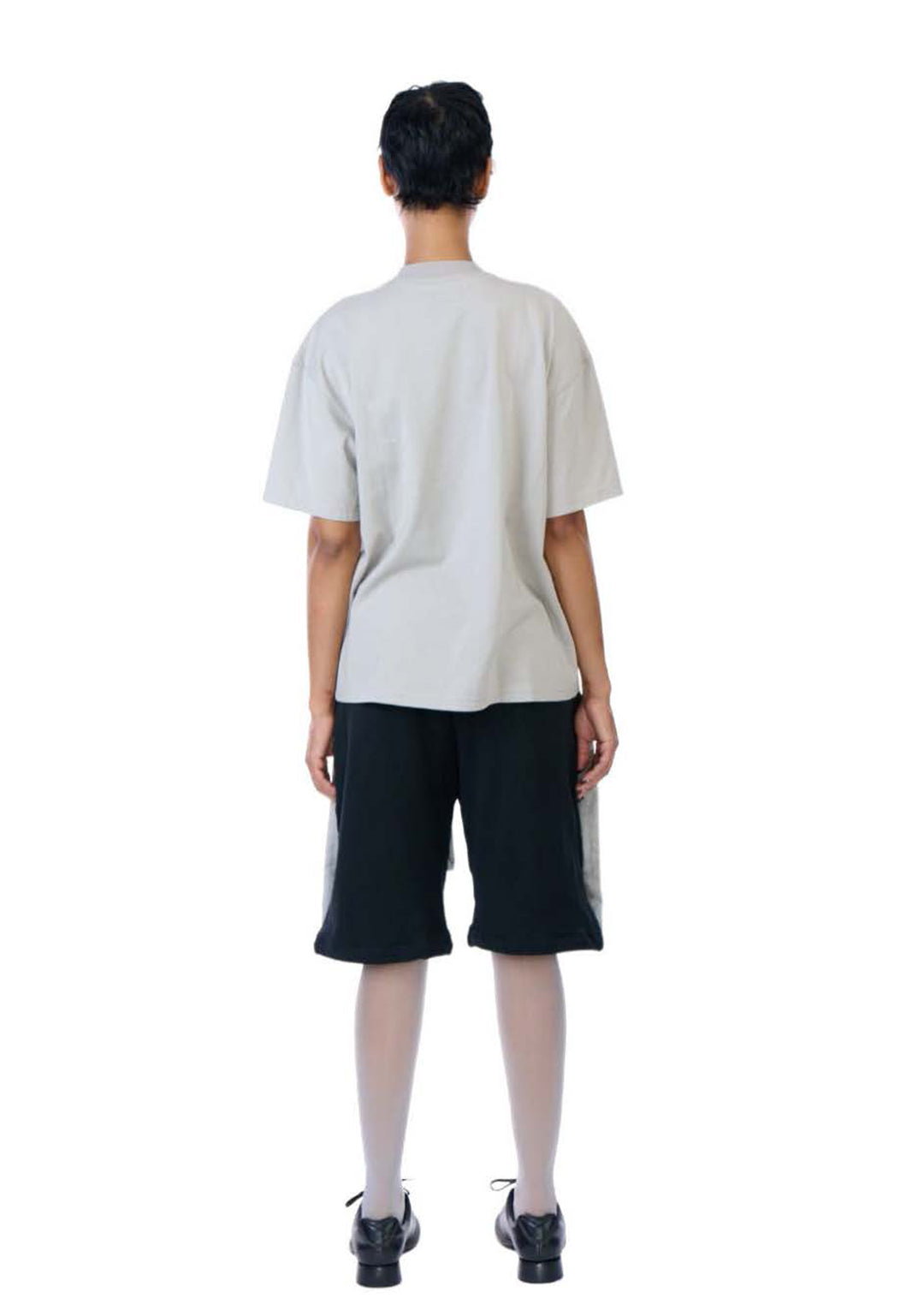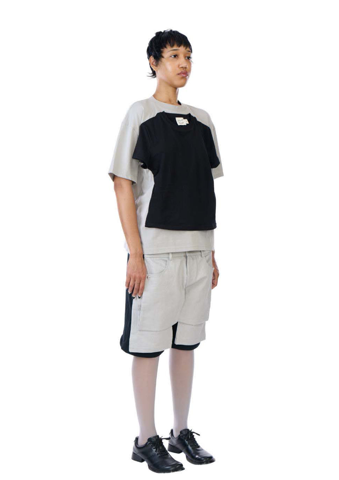 Layered short-sleeve cotton jersey t-shirt in black and grey. Features a cropped baby t-shirt in black attached to an oversized base layer in grey. Both layers can be worn individually.