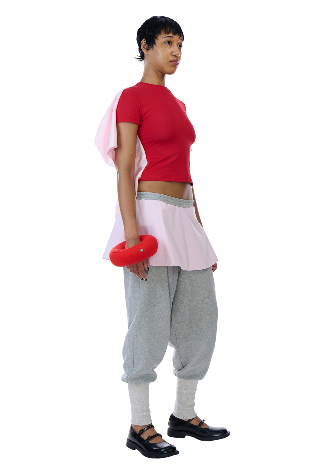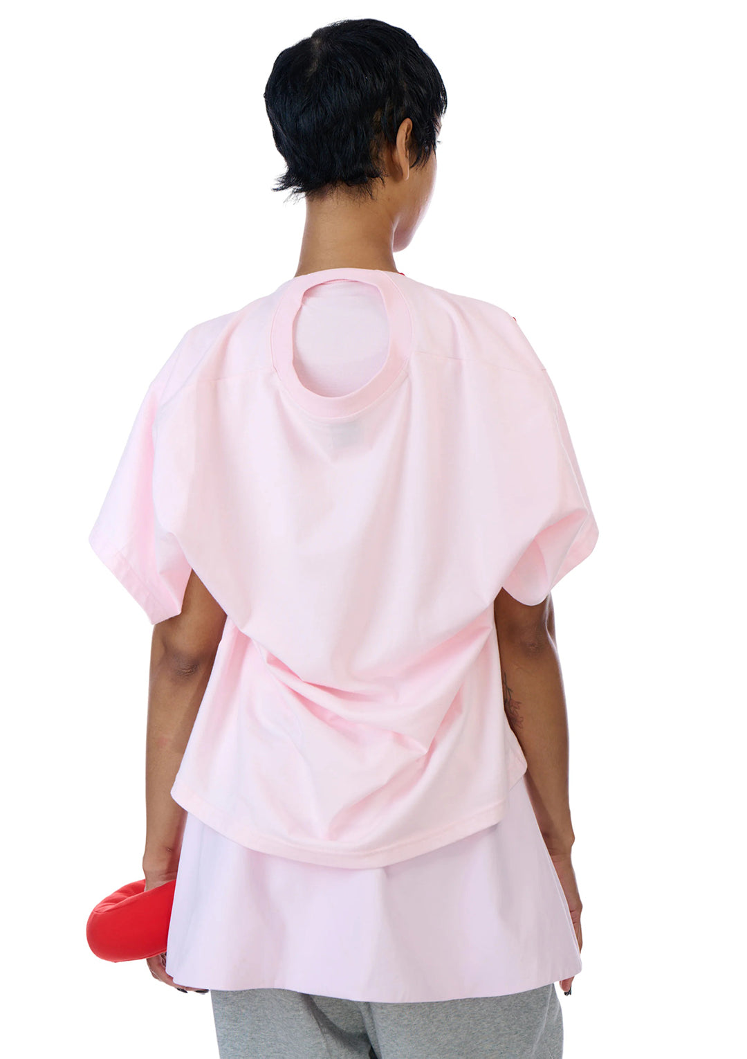 Layered short-sleeve cotton jersey t-shirt in red and pink. Features a cropped baby t-shirt in red attached to an oversized base layer in pink. Both layers can be worn individually.