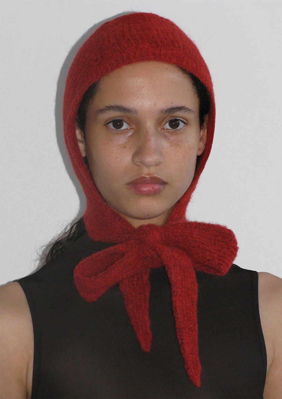Soft, warm knitted bonnet tied at the front. Color Red.